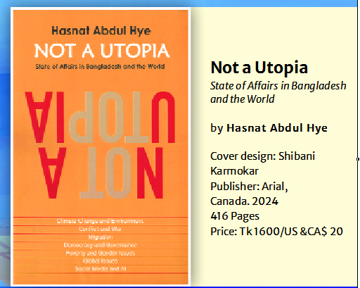 Not A Utopia, by Hasnat Abdul Hye, published around one and a half years ago, is an anthology that addresses a number of critical issues in the current world. The approach to the deal is not unrealistic but is ambitious to some extent, although apprehensive about its possible realisation. The author argues that addressing the problematic issues discussed in the book is possible, so it is not a utopia. Nevertheless, if addressed properly, it will become a matter of a dream coming true. According to the author: “On the one hand, the present state of affairs in the areas of human endeavour that matter for the commonweal of mankind is far from that of what can be called a utopia. On the other hand, it is being implied that if the malaise that afflicts them now could be consciously and sustainably alleviated, mankind’s life within national boundaries and bound by international relations could be improved by a degree that would appear near about that in a utopia.” (P-V)